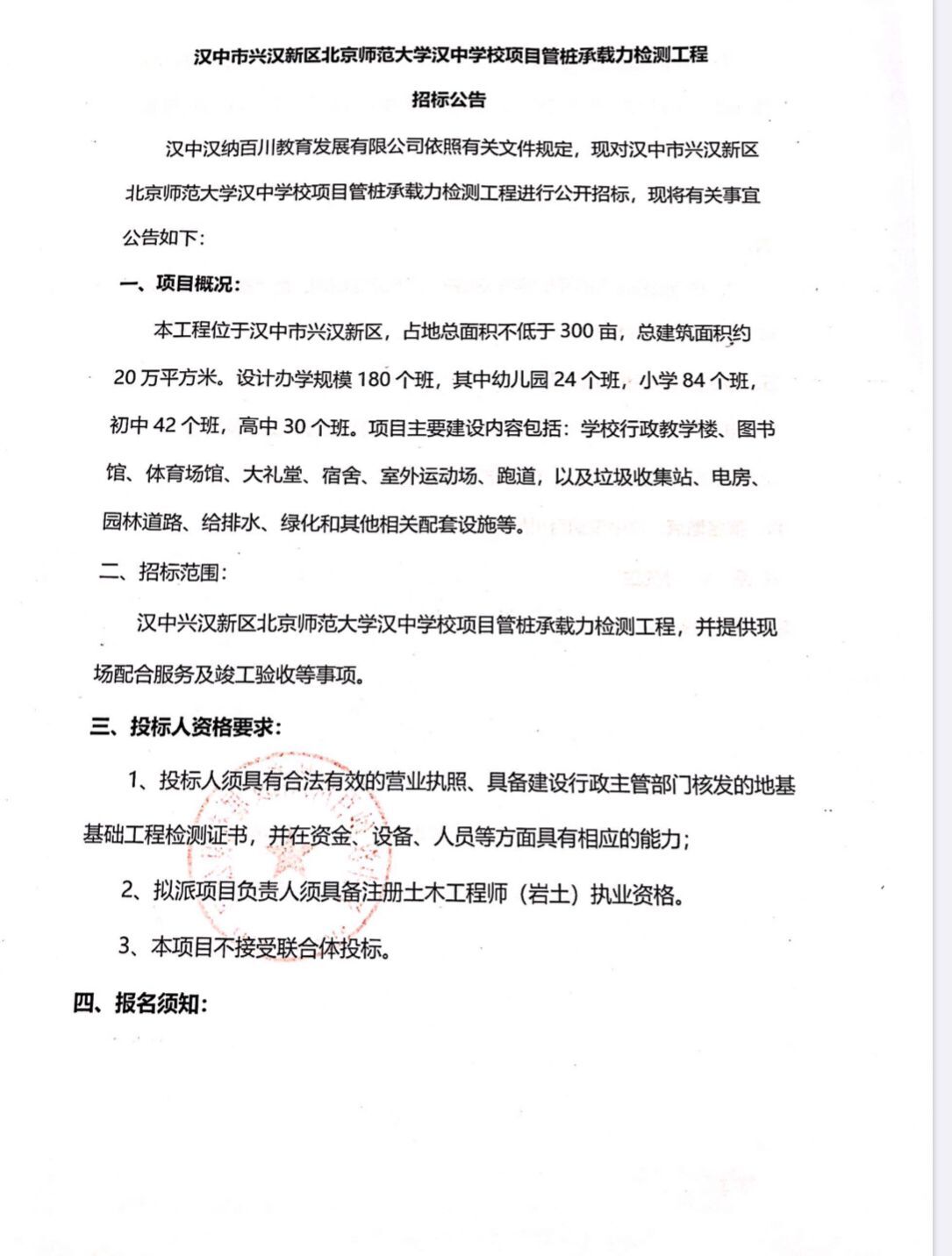 漢中市興漢新區(qū)北京師范大學(xué)漢中學(xué)校項目管樁承載力檢測工程招標(biāo)公告  漢中漢納百川教育發(fā)展有限公司...